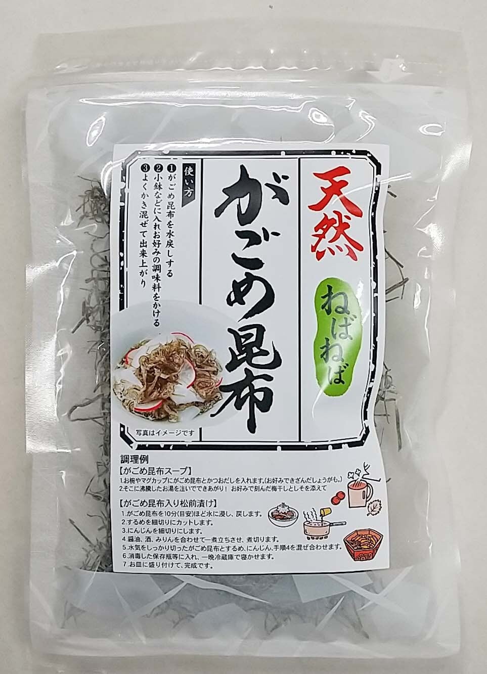 青森県大間産の天然がごめ昆布を細切りにしております。水に戻しをして、ポン酢などのお好みの味付けでお召し上がりください。そのまま汁物に入れてもおいしくお召し上がりいただけます。